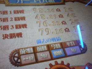 しかし「ワンダーフォーゲル」「ワールズエンズ・スーパーヴァ」では70点台に落ち込み、最後の「赤い電車」で68点を叩き出しorz